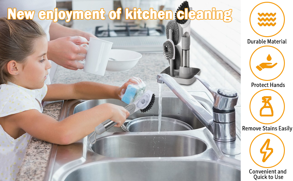 Extra Holder for Easy Storage: Comes with a holder to store the soap dishwashing brush and the other three replacement brush heads, the sink at the bottom can catch dripping water after use, which greatly save space and keep your kitchen tidy, clean and dry