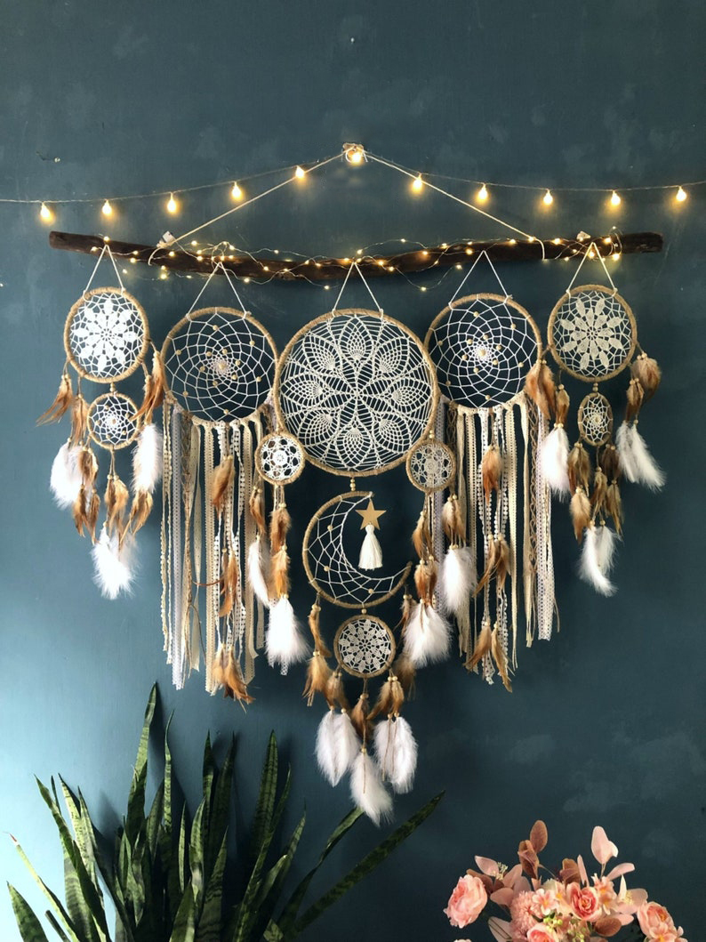 This dreamcatcher set consists of 5 rounds of dream sizes. They are very suitable for decorating the baby's bedside, bedroom.